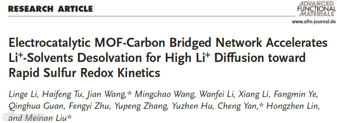 Linge Li, Haifeng Tu, Jian Wang, Mingchao Wang, Wanfei Li, Xiang Li, Fangmin Ye, Qinghua Guan, Fengyi Zhu, Yupeng Zhang, Yuzhen Hu, Cheng Yan, Hongzhen Lin, Meinan Liu, Electrocatalytic MOF-Carbon Bridged Network Accelerates Li-Solvents Desolvation for High Li Diffusion toward Rapid Sulfur Redox Kinetics, Adv. Funct. Mater. 2023, 2212499.