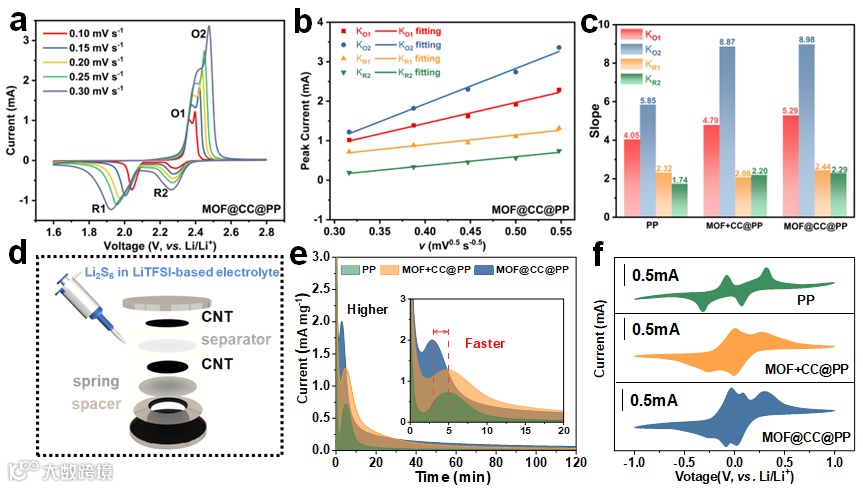 所设计的MOF@CC界面在实际电池中展现出优异的动力学表现和应用潜力。通过设计电化学实验,对改性界面的催化性能进行研究。在相同多硫化物添加量的情况下,比于普通隔膜或未桥联材料,桥联后的MOF@CC样品表现出更短的响应时间、更快的反应速率、以及更高的转化量。