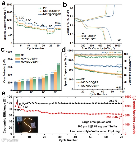 在赋予离子-电子双导通性质的反应界面,以MOF@CC结构中的活性C-N桥联键作为吸附和催化位点,降低了溶剂分子与锂离子的结合作用,使摆脱溶剂壳包裹的高活性锂离子更快传导至位点处,并与多硫化物接触发生电子交换反应。使用催化去溶剂化功能界面的隔膜组装锂硫电池,在0.5C表现出1063 mAh g-1的可逆容量,和5C下765 mAh g-1的高倍率性能。