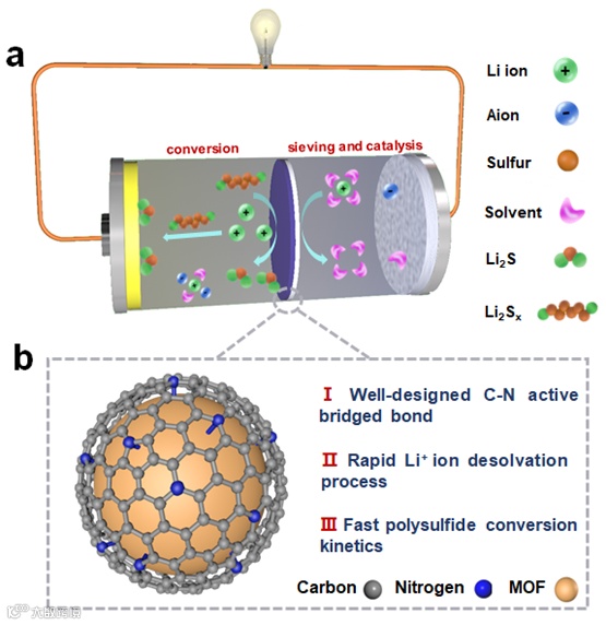 针对硫正极转化反应动力学及锂离子传输动力学不佳的问题,中科院苏州纳米所刘美男项目研究员联合德国卡尔斯鲁厄理工学院王健博士以及澳洲昆士兰科技大学Cheng Yan教授,利用具有功能性基团的金属有机框架材料,设计了桥联结构的MOF-碳界面,实现催化加速锂离子去溶剂化和多硫化物转化的过程。