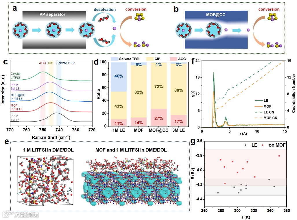 该过程不仅需要消耗额外的能量,也会降低反应速率,导致电池动力学性能不佳。而在改性后的隔膜界面,当这些大尺寸的溶剂化锂离子通过MOF@CC层内部狭窄通道(<0.8 nm)时,外层的溶剂化鞘层可以被有效筛分形成高活性的裸核锂离子,快速传导至反应位点参与转化反应。利用Raman光谱和分子动力学模拟,证明了MOF@CC界面锂离子与溶剂分子的结合能降低,溶剂配位数减少。去溶剂化后产生的高活性锂离子比例,甚至高于高浓度电解液(3M LiTFSI)。