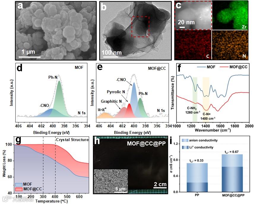 通过X射线光电子能谱(XPS)、傅里叶变换红外(FTIR)和热重分析仪(TGA)进一步研究了MOF@CC中的C-N桥联键的形成机制,这主要归结为MOF配体中的氨基可以与GO和无定形碳中C原子形成C-N桥联键。将MOF@CC材料湿法涂覆在PP隔膜上(MOF@CC@PP),不仅赋予该界面电子传导性,也实现了高锂离子迁移数(0.67)与高离子电导率(0.94 mS cm-1)。