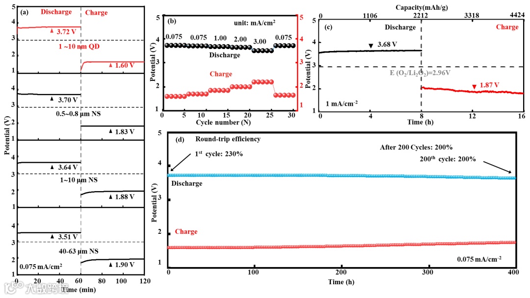 与大尺寸硅氧烯纳米片(SNSs)相比,硅氧烯量子点(SQD)Li-O2电池在3.72 V最高放电电位和1.60 V最低充电电位情况下具有230%往返效率。在0.075 mA/cm2的电流密度下,200次循环后仅有13%的效率衰减。同时,在3 mA/cm2时显示出162%的高往返效率及2212 mAh/g的高放电容量。