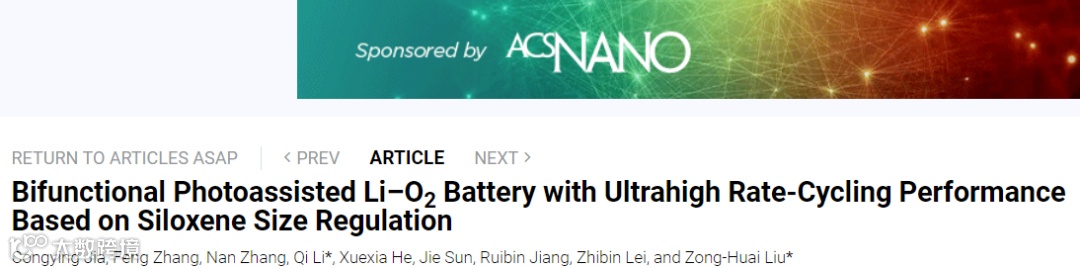 基于此,陕西师范大学材料与科学工程学院刘宗怀教授和李琪副教授课题组,在国际期刊ACS Nano上发表题为“Bifunctional photo-assisted Li-O2 battery with ultrahigh rate-cycling performance based on siloxene size regulation”文章。该研究工作在不同尺寸硅氧烯纳米片可控制备基础上,将制备的不同尺寸硅氧烯作为可充电Li-O2电池的双功能光催化剂,系统研究了不同尺寸硅氧烯双功能光催化剂提高Li-O2电池储能机制,为实现可充电Li-O2电池的性能提升提供了新途径。