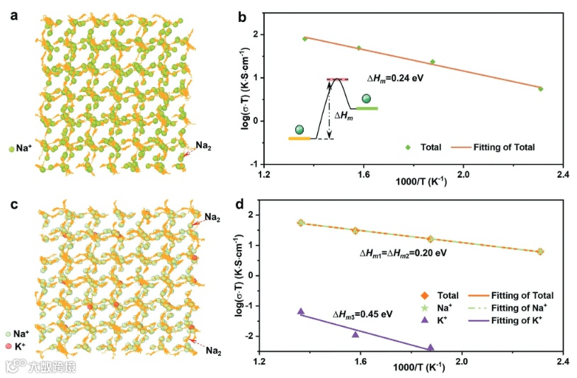 图3 (a-b)MD模拟的Na+离子运动轨迹及在NZSP中迁移能垒;(c-d)MD模拟的含K+离子的NZSP中离子迁移轨迹及能垒。