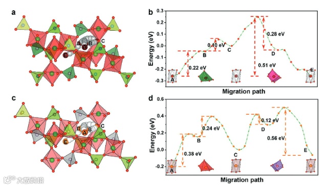 图2 (a-b)CINEB计算的Na+离子在NZSP中迁移示意图及能垒;(c-d)CINEB计算的K+离子在NZSP中迁移示意图及能垒。