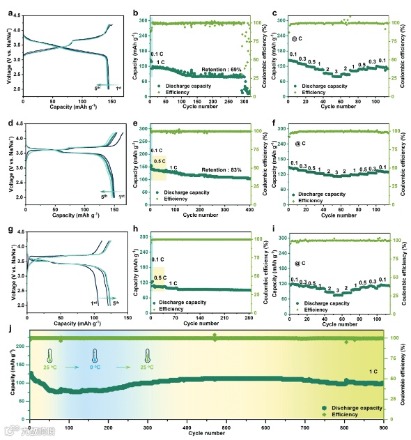 图4 (a-c) NMF基固态钠金属电池的电化学性能;(d-j) KMF基固态钠金属电池的电化学性能。