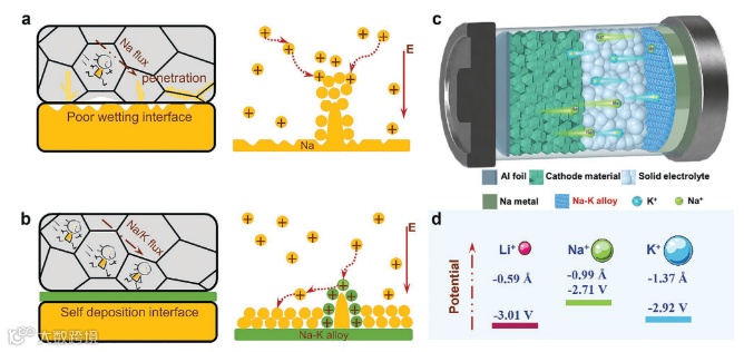 北京理工大学的研究团队在Advanced Energy Materials上发表了题为“Rechargeable Sodium Solid-State Battery Enabled by In Situ Formed Na–K Interphase”的观点文章。该文章分析了基于K2MnFe(CN)6等正极匹配 Na3Zr2Si2PO12固态电解质的循环稳定性。分析比较了离子扩散动力学、界面相形成及枝晶抑制等科学问题。