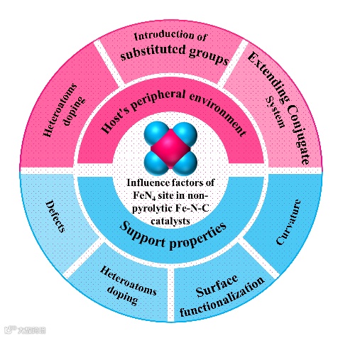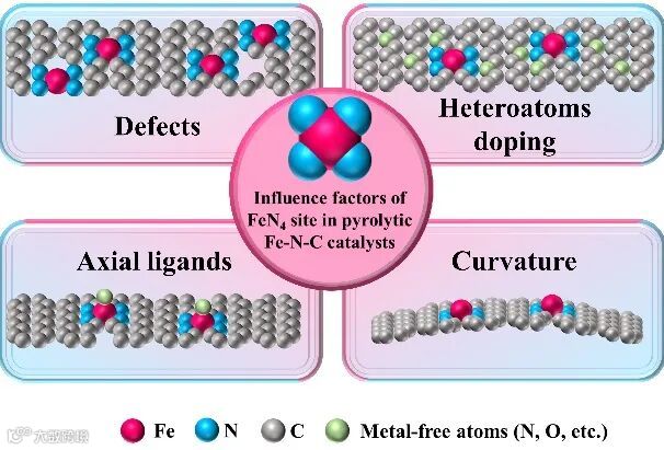 其次,Fe-N-C催化剂中的活性位点具有多样性和复杂性,主要包括含Fe位点(Fe基纳米颗粒和单原子Fe物种)和非金属位点(异原子掺杂和缺陷)。Fe基纳米颗粒有Fe的单质、碳化物、氮化物、氧化物等多种形式,有时具有碳层包覆的表面结构;单原子Fe物种存在FeNx和FeMNx(x=1~6, M=Fe, Co, Mn, Ni, Zn, Mo等)类型。其中,FeN4活性位点备受关注,本文通过异原子掺杂、取代基团引入、表面官能化、曲率、缺陷等多个角度,对Fe-N-C催化剂中FeN4位点的影响因素进行了系统论述。