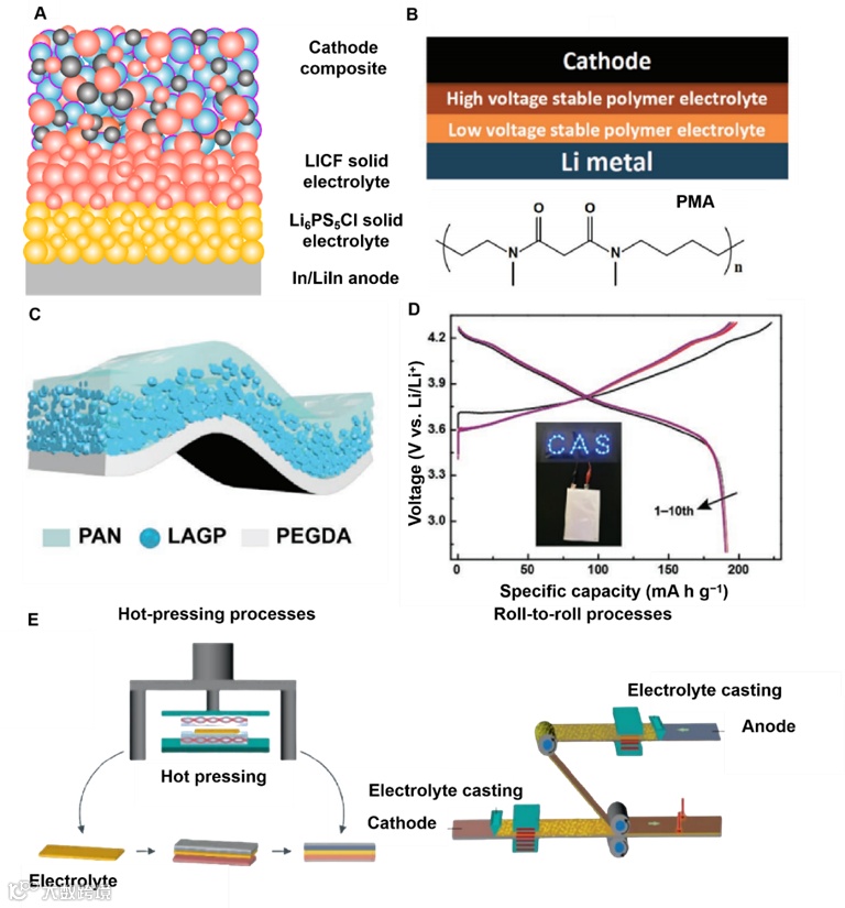 3)非对称结构的双层/多层电解质设计可以结合不同固态电解质的优点。特别是具有高机械模量和离子电导率的陶瓷/聚合物不对称电解质是最实用的选择之一。(图3)