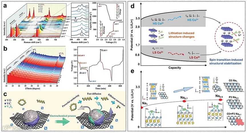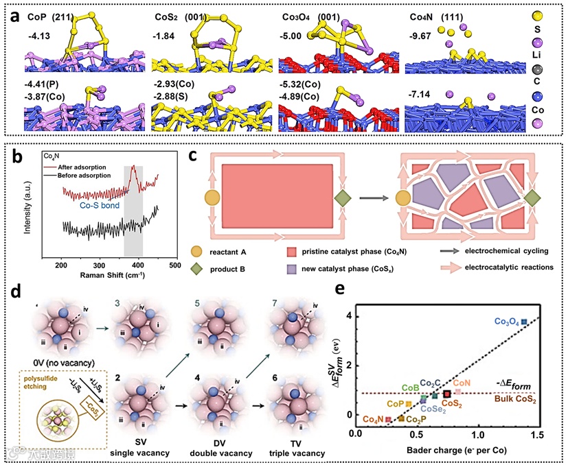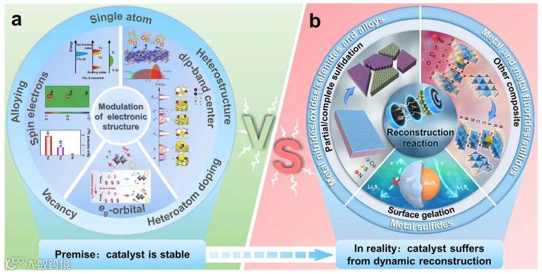 图1. 锂硫电池(a)催化剂电子结构调控策略及(b)催化剂动态重构。