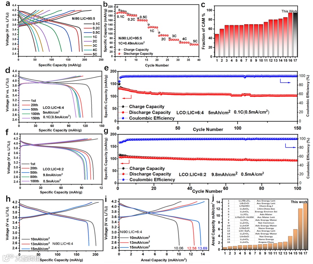 图 7 NCM90或LCO-Li3InCl6/Li3Inl6/Li6PS5Cl/Li具有FD200 SE的高CAM比例和高负载性能。(a)ASSB在不同倍率下的初始充放电曲线;(b) 0.1、0.2、0.5、1、2、3、4和5C时的倍率性能;(c) CAM比例与文献比较;(d-e)5mAh/cm2下的循环性能;(f-g)在9.8mAh/cm2下的循环性能;(h-i)ASSB在各种阴极负载下的充放电曲线;(j) 放电容量与文献的比较。