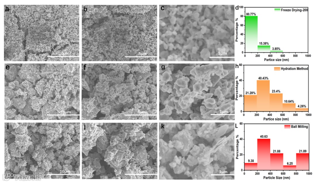 图 3 通过不同方法合成的Li3InCl6的SEM图像。(a,b,c)冷冻干燥-200;(e,f,g)水合法。(i,j,k)球磨法。用不同方法合成的Li3InCl6颗粒尺寸的统计分布。(d) 冷冻干燥-200;(h)水合法;(l)球磨法。