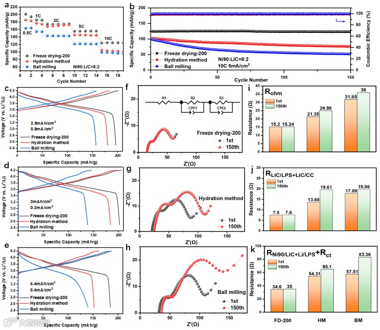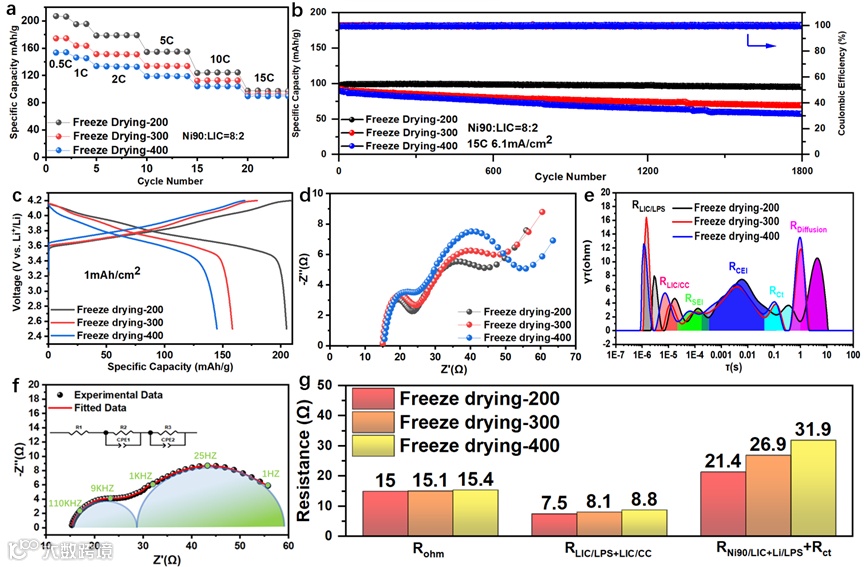 然而,值得注意的是,尽管这种方法可以客观地获得不同界面对应的真实频率,但由于阻抗值相似,阻抗被分为三部分进行拟合(如图2g所示)。Rohm表示ASSB的欧姆阻抗,RLIC/LPS+LIC/CC(R2)表示卤化物LIC SE层和硫化物LPS SE层之间的界面阻抗之和以及复合正极中的卤化物SE和集流体之间的界面电阻。RNi90/LIC+Li/LPS+Rct(R3)表示复合正极中活性材料NCM90和LIC SE之间的界面阻抗以及硫化物SE LPS层和负极之间的界面电阻以及Rct阻抗的总和。