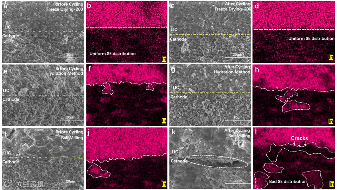为了直接观察循环前后的阴极/SE界面,对具有不同SE的组装ASSB进行了截面SEM研究。从图5a-d可以看出,具有FD200 SE的ASSB在阴极中显示出最均匀的SE分布和最光滑的阴极/SE界面。然而,具有HM合成的SE的ASSB(图5e-h)和BM(图5i-l)在阴极中具有不均匀分布。随着活性阴极材料的体积变化,HM ASSB在循环后的阴极中出现团聚现象,而BM ASSB甚至在阴极中出现裂纹,这也是电池循环性能差的原因。