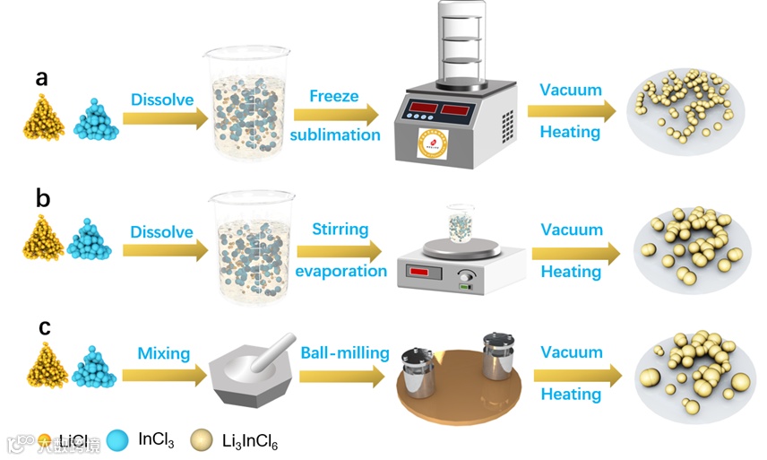 图 1 Li3InCl6三种不同合成方法示意图。(a)冷冻干燥法;(b)水合法;(c)球磨法