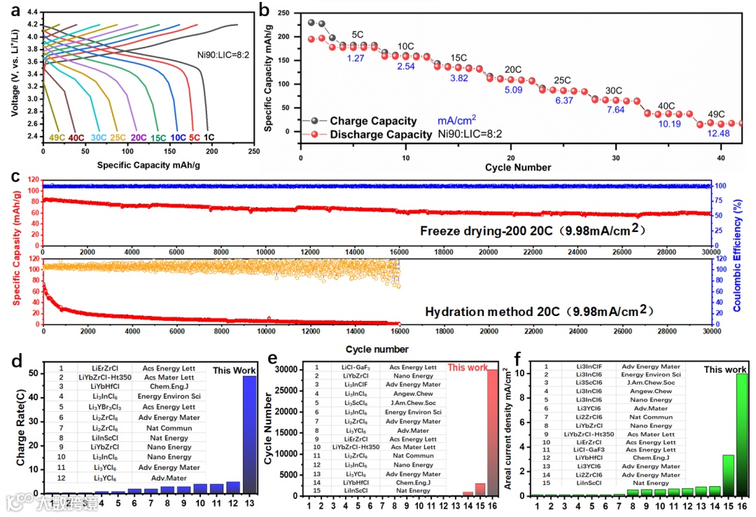 显然,这项工作中30000次循环的循环寿命和面电流密度(9.98mA/cm2)远远超过了卤化物SE所能达到的最高水平(分别为3000次循环和3.36mA/cm2)。这是由于通过冷冻干燥技术大大减小了SE的粒度,并由此实现了均匀分布,这大大改善了ASSB中的锂导电网络和界面接触,以承受充电/放电过程中电极材料大体积变化的不利影响。因此,实现了49C的超高倍率和在9.98mA/cm2的超高电流密度下30000次循环的超长稳定寿命。