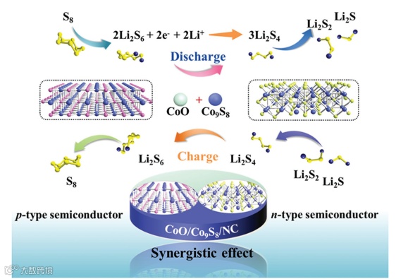 该工作提出了使用类沸石咪唑骨架作为前驱体来获得具有异质的CoO/Co9S8/NC中空硫载体。异质的CoO/Co9S8/NC平衡了Co9S8的氧化还原动力学与CoO对LiPSs的化学吸附,有效抑制了LiPSs的穿梭。通过实验和密度泛函理论计算验证了这些机理。同时,中空结构起到了硫储存室的作用,缓解了硫的体积膨胀,最大限度地利用了硫。基于上述优点的S-CoO/Co9S8/NC锂硫电池在0.1 C电流密度下实现了高初始放电容量(1470 mAh g−1)和长循环寿命(在1 C电流密度下1000次循环后,每圈的容量衰减率为0.033%)。