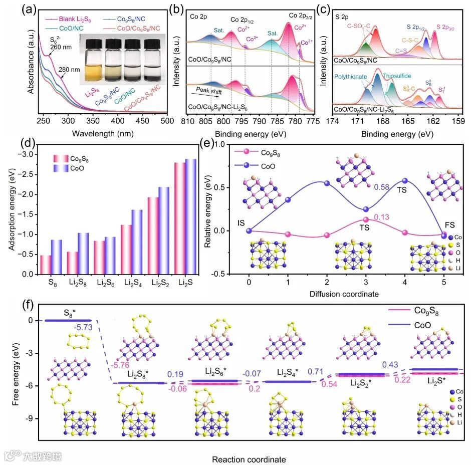 图3. (a) Li2S6、CoO/Co9S8/NC-Li2S6、Co9S8/NC-Li2S6和CoO/NC-Li2S6的紫外-可见吸收光谱。CoO/Co9S8/NC和CoO/Co9S8/NC-Li2S6的(b) Co 2p和(c) S 2p高分辨率XPS光谱。(d) LiPSs在CoO和Co9S8上的结合能。(e) Li+在CoO和Co9S8基底上的扩散能垒。(f) CoO和Co9S8上LiPSs转化的自由能,包括自由能图以及中间体的相应几何结构。
