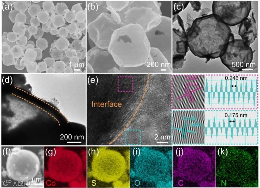 图2. CoO/Co9S8/NC的形态特征:(a,b)SEM图像,(c,d)TEM图像,(e)HRTEM图像和拟合的FFT,(f)SEM图像和(g-k)相应的元素映射图像。