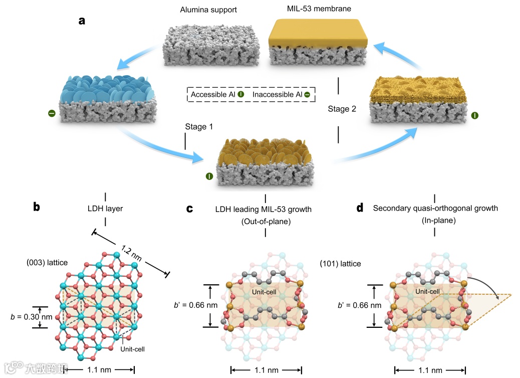 研究发现,MIL-53膜的生长分为两个阶段。在第一个阶段,LDH作为铝源供给型模板,可引导MIL-53晶体沿面外进行印迹复制型生长:约8个LDH六方晶格被同步替换为1个MIL-53正交晶格,形成膜的基础架构;在第二个阶段,随着LDH模板牺牲,可动态调控氧化铝载体中铝源的可用性,引导MIL-53晶体沿面内准正交生长,协同获得高度致密的MIL-53膜。