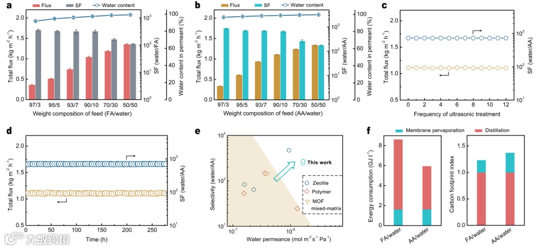 Figure 3. Dewatering performances of MIL-53 membranes for acids at 65 °C. (a–b) Separation properties toward different weight compositions of FA/water and AA/water feed solutions. c) Separation properties toward the 90/10 AA/water feed solution with the frequency of the ultrasonic treatment. d) Long-term separation stability toward the 90/10 AA/water feed solution. e) Comparisons with previously reported membranes. f) Energy consumption (GJ per ton feed solution) and carbon footprint index of the current membrane-based pervaporation and traditional distillation (azeotropic distillation for FA/water and vacuum distillation for AA/water). The benchmark value of carbon footprint index of distillation is defined as 1.0.