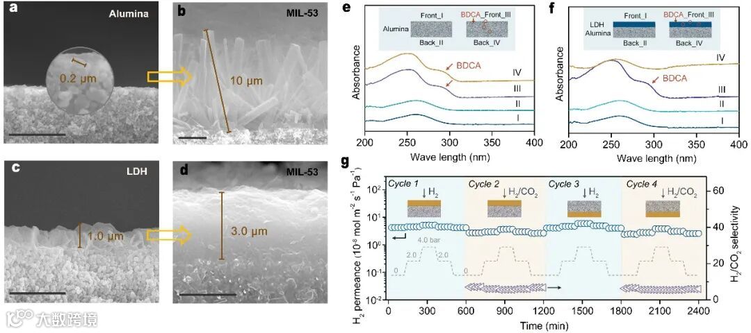 Figure 1. A LDH template triggering the growth of the MIL-53 membrane. (a-d) Cross-sectional SEM images of the α-phase alumina support, branch-like MIL-53 layer, LDH layer, and highly compact membrane. Scale bar, 2.5 μm. (e-f) Accessibility of the alumina support to BDCA solution reflected by UV/Vis spectra. Arrows are pointing to signals from BDCA. g) Durability of the membrane in repeated gas pressure regulation cycles.