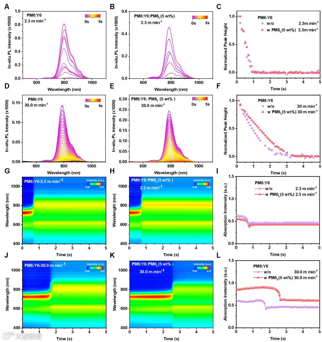 图2. 未掺杂和掺杂少量PM6L的PM6:Y6活性层体系的(A-F)原位荧光光谱变化谱图及处理数据和(G-L)原位吸收变化谱图及处理数据。