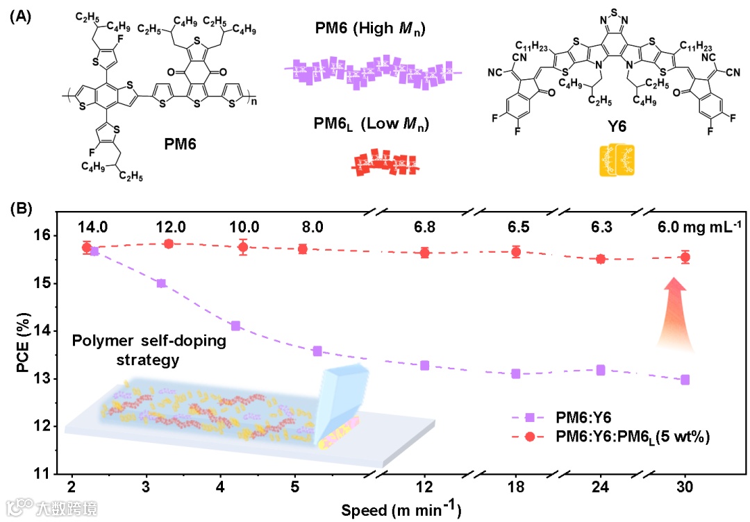 图1(A)本工作中研究的活性层材料分子结构;(B)未掺杂和掺杂PM6L的PM6:Y6活性层器件性能随刮涂速度的变化趋势。