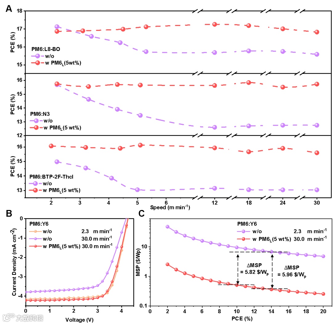 图3. (A)未掺杂和掺杂PM6L的PM6:L8-BO、PM6:N3和PM6:BTP-2F-ThCl体系器件性能随刮涂速度的变化趋势;(B)不同涂覆速度下,未掺杂和掺杂PM6L的PM6:Y6体系制备组件的J-V曲线;(C)未掺杂和掺杂PM6L的PM6:Y6体系的MSP分析。