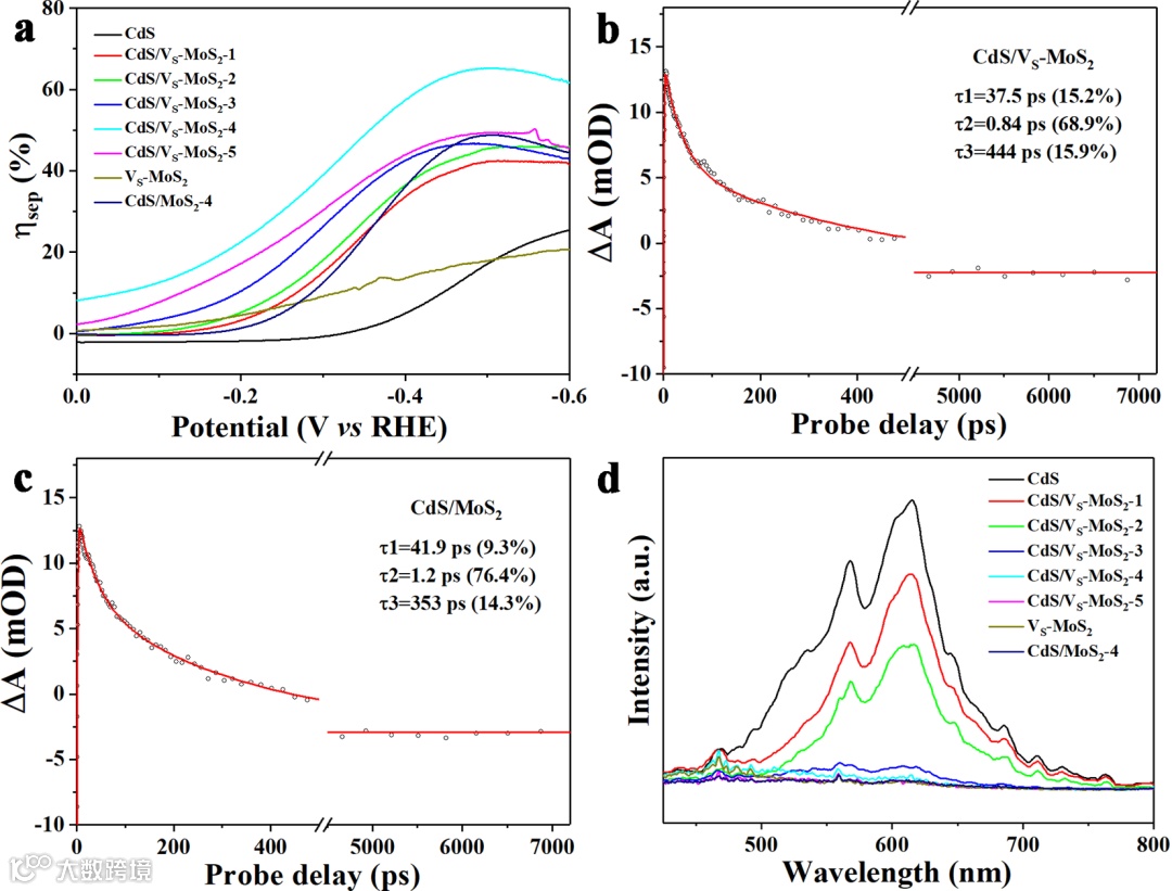图3.(a)电荷分离效率;飞秒瞬态吸收光谱:(b)CdS/VS-MoS2;(c)CdS/MoS2;(d)PL光谱。