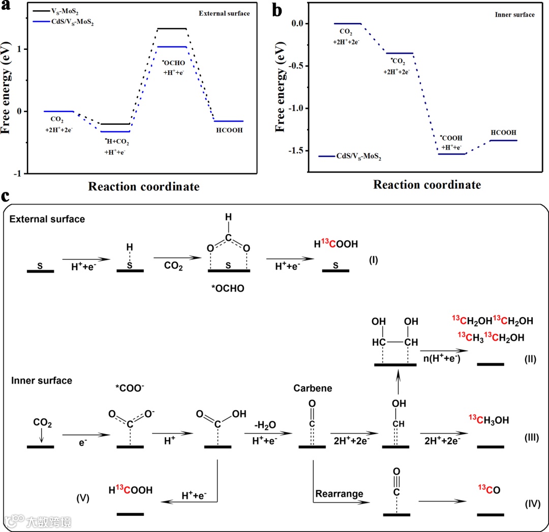 基于同位素标记实验和DFT计算,提出了外表面和内表面的两种可能的反应路径。在以VS-MoS2为主的催化剂的外表面,质子被硫空位处的电子俘获形成活性氢原子(*H)。CO2分子与*H结合生成*OCHO中间体,并进一步生成甲酸(路径I)。