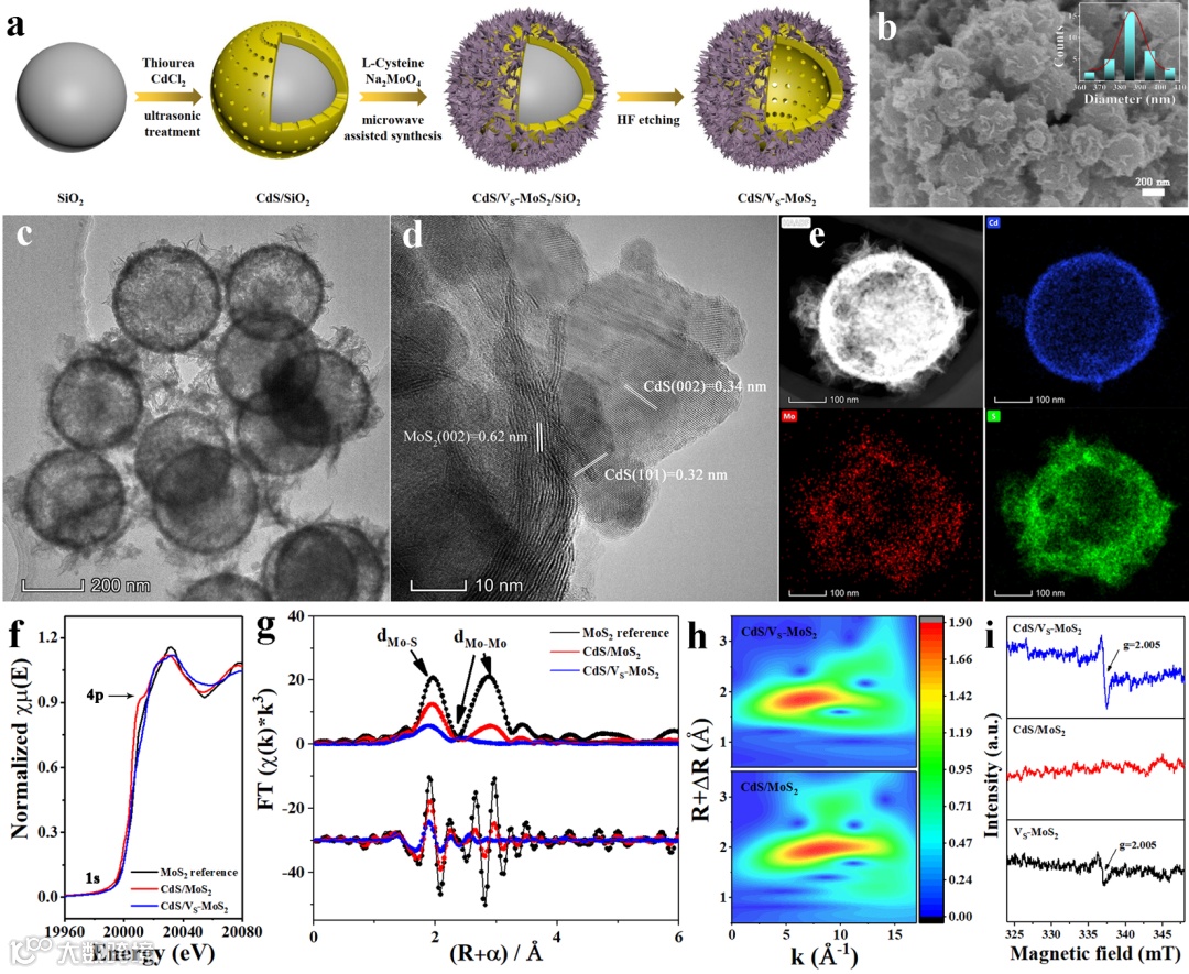 图2.(a)CdS/VS-MoS2异质结的合成示意图;(b)SEM图;(c)TEM图;(d)HRTEM图;(e)EDX mapping图;(f)Mo的K边XANES谱;(g)FT-EXAFS谱;(h)CdS/VS-MoS2和CdS/MoS2的小波变换图;(i)EPR谱图。