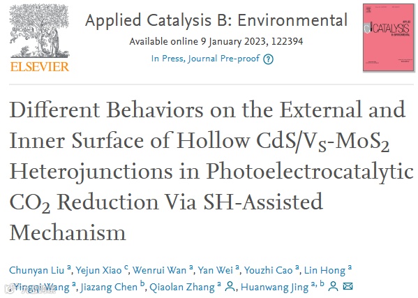 基于此,兰州大学景欢旺教授团队在国际知名期刊Applied Catalysis B: Environmental上发表的题为“Different behaviors on the external and inner surface of hollow CdS/VS-MoS2 heterojunctions in photoelectrocatalytic CO2 reduction via SH-assisted mechanism”的研究论文。