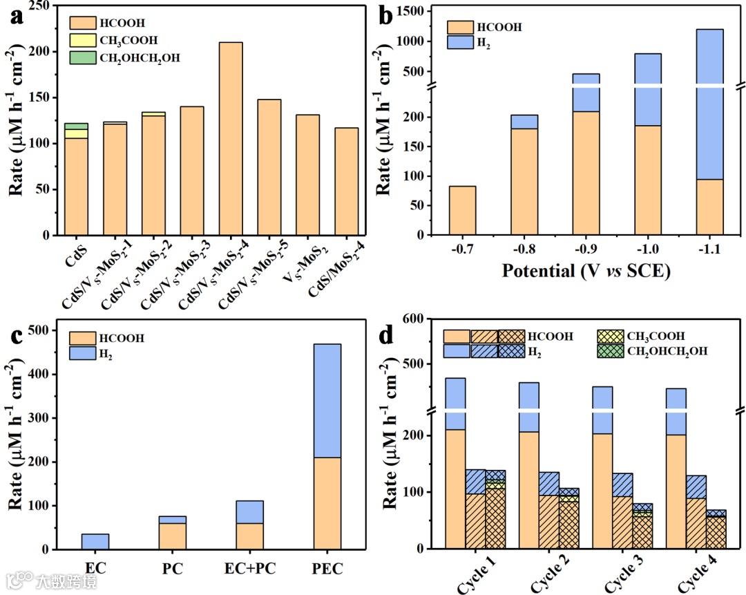 在中空催化剂的外表面,主要的还原产物均为甲酸。其中,CdS/VS-MoS2-4催化剂的甲酸生成速率高达210 M h-1 cm-2,这归因于异质结界面处的内建电场的形成和硫空位对电子的聚集作用。0.9 V的偏压是生成甲酸的最佳反应电位。从对照实验可以看出,在PEC条件下的产率是PC和EC条件下产率总和的五倍之多。此外,稳定性测试表明异质结的形成有助于提高催化剂的稳定性。