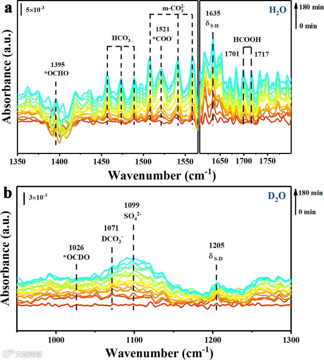 除了反应中间体,1701和1717 cm-1观察到了产物甲酸和甲酸根对应的振动吸收峰。为了进一步验证含有H原子的物种的归属的合理性,将水溶液替换为氘水。不出所料,在1205、1071和1026 cm-1观察到了DS、DCO3-和*OCDO等氘物种的振动峰。