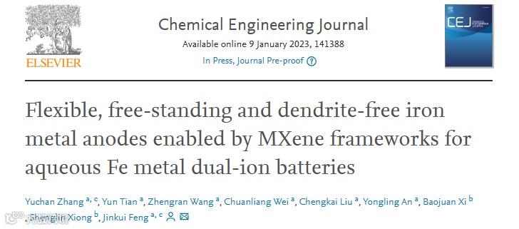 基于此,来自山东大学的冯金奎教授在国际知名期刊Chemical Engineering Journal上发表题为“Flexible, free-standing and dendrite-free iron metal anodes enabled by MXene frameworks for aqueous Fe metal dual-ion batteries”的文章。该文章设计了一种新的MXene/Fe异质结构作为Fe金属电池的负极,实现无枝晶铁金属负极。