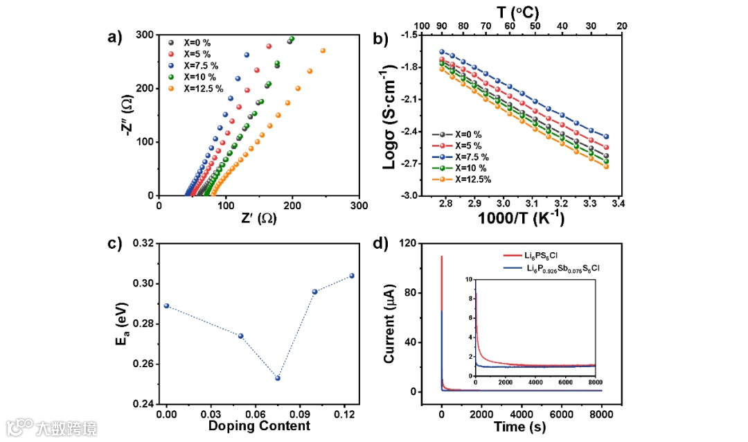 Fig. 2. a) Nyquist curves at 25 oC and b) Arrhenius plots of the Li6P1-xSbxS5Cl (0 ≤ x ≤ 12.5%) SSEs tested from 25 to 90 oC. c) Variation of activation energy of electrolytes with Sb doping content. d) Current-time curves of SS/Li6PS5Cl/SS and SS/Li6P0.925Sb0.075S5Cl/SS symmetric cells under DC polarization.