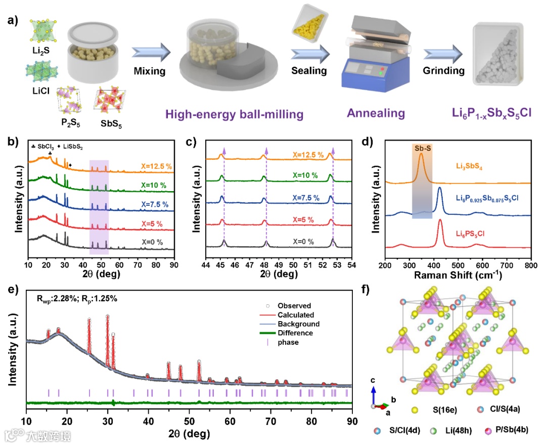 Fig. 1. a) Schematic illustration of the synthesis process for Li6P1-xSbxS5Cll. b) XRD patterns of the prepared Li6P1-xSbxS5Cl (0 ≤ x ≤ 12.5%). c) Magnified XRD patterns for the prepared Li6P1-xSbxS5Cl SSEs in the range of 44° ≤ 2θ ≤ 54°. d) Raman spectra of Li6P0.925Sb0.075S5Cl SSEs compared with Li6PS5Cl and Li3SbS4 SSEs. e) Rietveld refinements patterns for the Li6P0.925Sb0.075S5Cl SSEs. f) Crystal structure of the optimized Li6P0.925Sb0.075S5Cl SSEs.