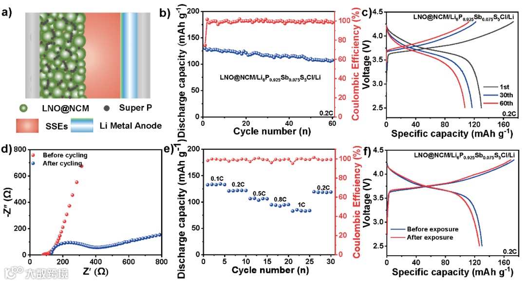 Fig. 5. a) Schematic diagram illustrating the configuration of the fabricated LNO@NCM/Li6P0.925Sb0.075S5Cl/Li ASSLMBs. b) Cycling capability and c) charging/discharging curves of LNO@NCM/Li6P0.925Sb0.075S5Cl/Li batteries at 0.2C. d) Impedance spectra of the LNO@NCM/Li6P0.925Sb0.075S5Cl/Li batteries before and after 60 cycles. e) Rate performance of the LNO@NCM/Li6P0.925Sb0.075S5Cl/Li batteries f) The initial charging/discharging curves of the LNO@NCM/Li6P0.925Sb0.075S5Cl/Li ASSLMBs using Li6P0.925Sb0.075S5Cl as the SSE before and after air exposure.