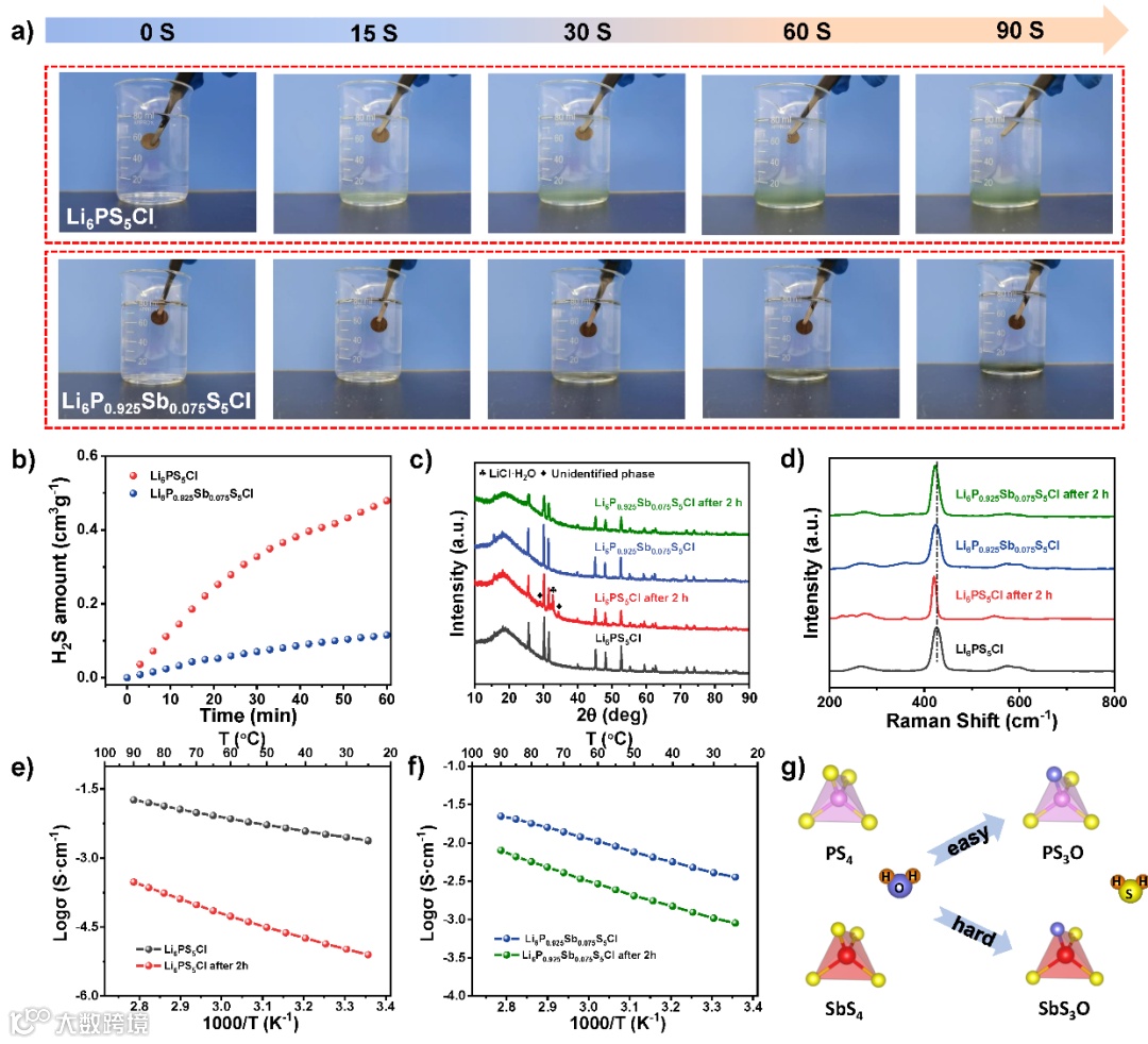 Fig. 3. a) Optical photographs of Li6PS5Cl and Li6P0.925Sb0.075S5Cl completely immersed in deionized water at room temperature. b) The quantity of H2S gas generated from Li6PS5Cl and Li6P0.925Sb0.075S5Cl upon exposure to humid air. c) XRD patterns and d) Raman spectra of Li6PS5Cl and Li6P0.925Sb0.075S5Cl before and after exposure to humid air. Arrhenius plots of the prepared e) Li6PS5Cl and f) Li6P0.925Sb0.075S5Cl before and after exposure to humid air. g) Schematic diagram of the difficulty degree of PS4 and SbS4 units when reacted with H2O according to the DFT calculations.