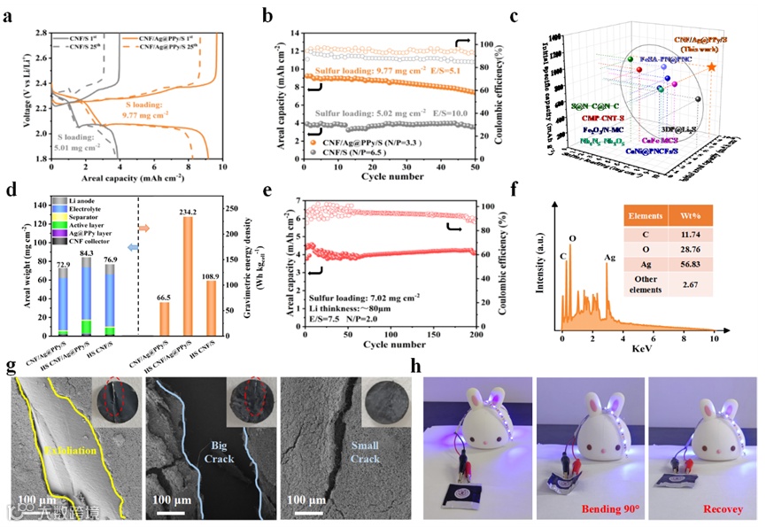 Fig. 4. Practical performance of the batteries with the CNF/Ag@PPy/S cathode in various application scenarios. (a) Charge/discharge profiles and (b) Cycling performance of CNF/Ag@PPy/S and CNF/S under high S loading at 0.2 C; (c) Comparison of areal capacity and specific capacity of a high-loading Li-S batteries with that of other reported high-loading Li-S batteries. The complete raw data are shown in Table S7; (d) Comparison of both the areal weight and gravimetric energy density of conventional CNF/Ag@PPy/S Li-S battery, high S loading CNF/Ag@PPy/S Li-S battery (HS Ag@PPy) and high S loading CNF/S Li-S battery (HS CNF); (e) Cycling performance of the CNF/Ag@PPy/S cathode with a thinner Li anode (low N/P ratio of 2.0) at 0.2 C; (f) The EDS test of the black powder obtained by burning CNF/Ag@PPy/S cathode at 700 °C for 2 h; (g) The optical images of Al-foil/S, CNF/S and CNF/Ag@PPy/S cathodes after bending 100 times; (h) LED illuminating test by a practical Li-S pouch cell using the CNF/Ag@PPy current collector.