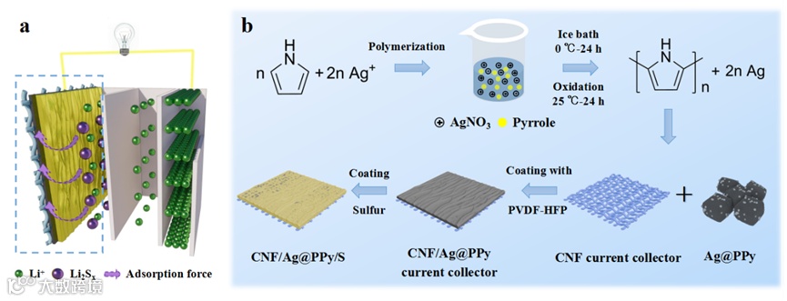 基于大规模低温化学氧化聚合技术,以吡咯单体和硝酸银为原料合成了Ag@PPy化合物。值得注意的是,硝酸银可以直接氧化吡咯单体,而不需要引入传统聚吡咯制备中经常使用的额外氧化剂(如Fe3+和过硫酸铵)。然后将合成的Ag@PPy与PVDF-HFP混合,均匀地涂覆在静电纺丝碳纤维上,形成最终的CNF/Ag@PPy集流体。CNF/Ag@PPy电流集流体的简单制备过程显示出巨大的扩展潜力。