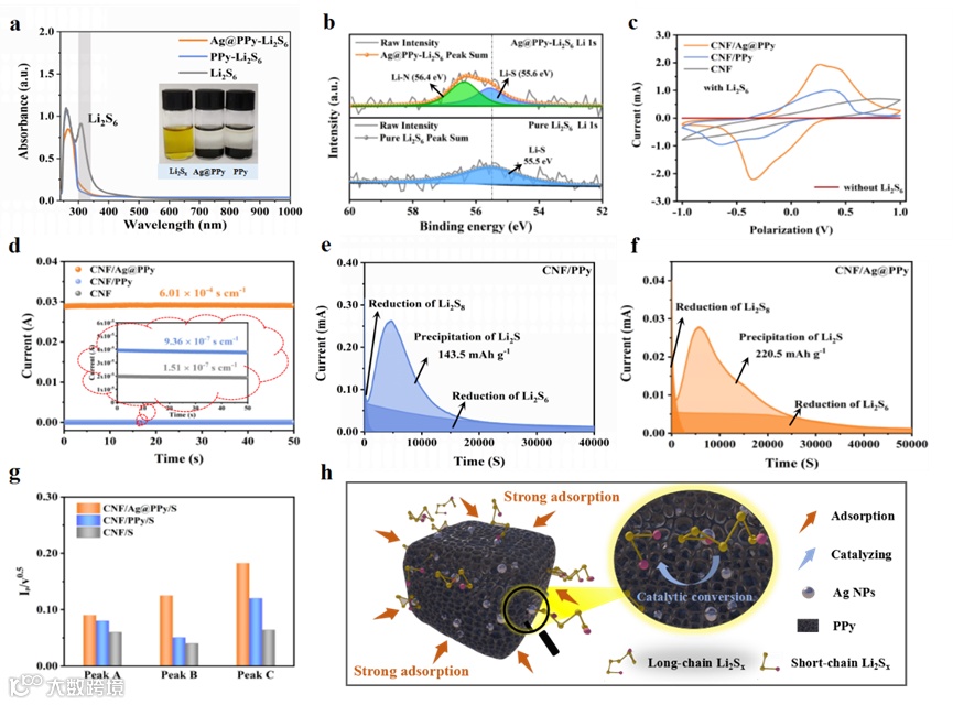Fig. 3. Adsorption and electrocatalytic tests for various samples. (a) UV-vis spectra and corresponding image (inset) of pure Li2S6 solution before and after the static adsorption of Li2S6 by PPy and Ag@PPy; (b) High-resolution Li 1s XPS spectra of PPy-Li2S6 and Ag@PPy-Li2S6 after the static adsorption test; (c) CV curves of the symmetric cells without or with Li2S6 solution assembled with three types of current collector; (d) The evolution of current with polarization time under the polarization voltage of 0.5 V in CNF/Ag@PPy, CNF/PPy and CNF; Potentiostatic discharge profile at 2.05 V on (e) CNF/PPy and (f) CNF/Ag@PPy current collector in Li-S batteries; (g) Ip/v0.5 values at peak A, peak B and peak C calculated by the corresponding fitted lines from the CV plots of various samples; (h) The mechanism (molecular scale) of the Ag@PPy compound on the adsorption and electrocatalytic conversion of LiPSs.