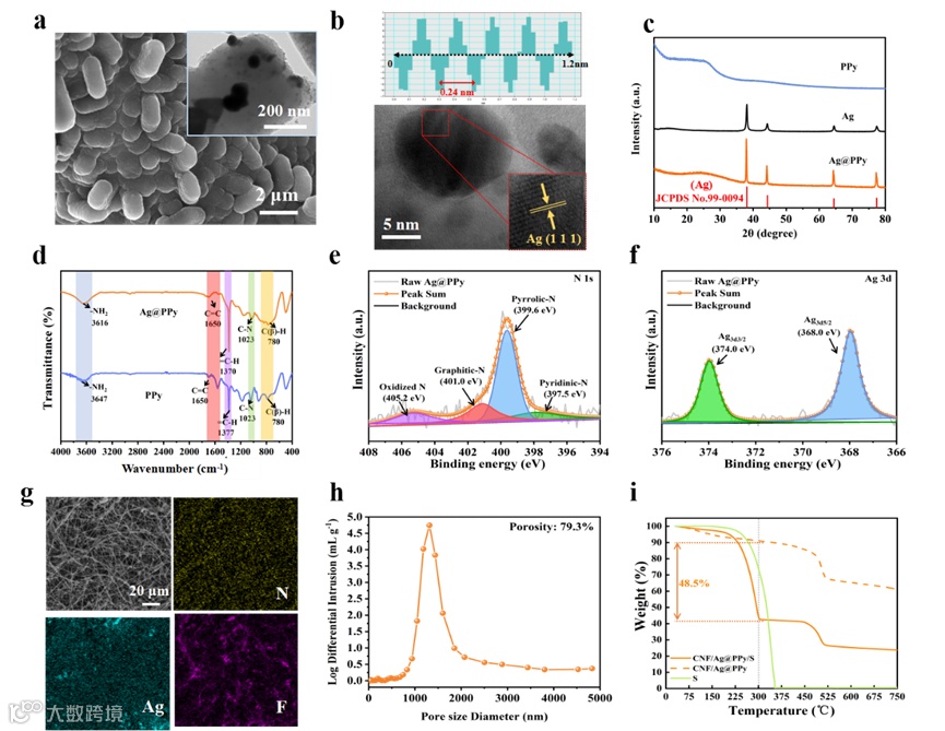 Fig. 2. Morphological and structural characterizations. (a) FE-SEM and FE-TEM (inset) images of the Ag@PPy sample; (b) HR-TEM image of the Ag@PPy sample; (c) XRD patterns of the PPy, Ag and Ag@PPy samples; (d) FT-IR spectra of the PPy and Ag@PPy samples; High-resolution XPS spectra of (e) N 1s and (f) Ag 3d of the Ag@PPy sample; (g) The EDS mapping of the CNF/Ag@PPy current collector; (h) The pore distribution of the CNF/Ag@PPy current collector based on the mercury intrusion method; (i) TGA spectra of CNF/Ag@PPy/S.