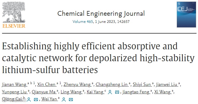基于此,西安交通大学延卫教授,王嘉楠副教授课题组联合英国萨里大学蔡琼教授,杨凯博士等,在国际化学领域顶级期刊Chemical Engineering Journal上发表题为“Establishing Highly Efficient Absorptive and Catalytic Network for Depolarized High-Stability Lithium-Sulfur Batteries”的研究论文。
