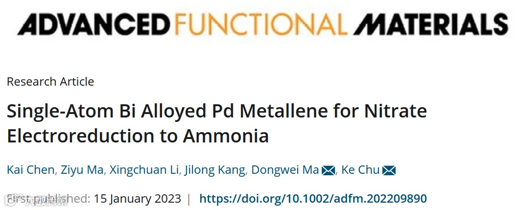 K. Chen#, Z. Ma#, X. Li, J. Kang, D. Ma*, K. Chu*, Single-atom Bi Alloyed Pd metallene for nitrate electroreduction to ammonia, Adv. Funct. Mater., (2023).