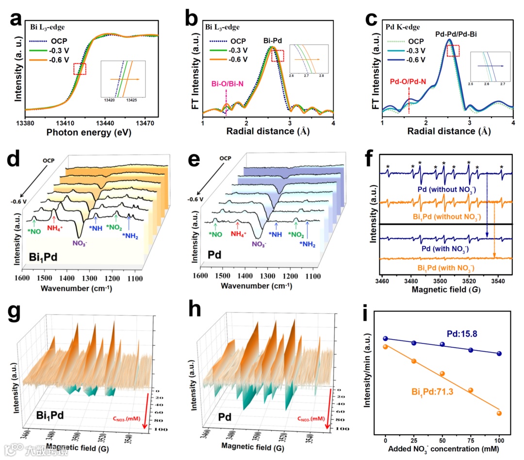 图5. 电化学原位光谱分析Pd和Bi1Pd的NO3RR反应过程
