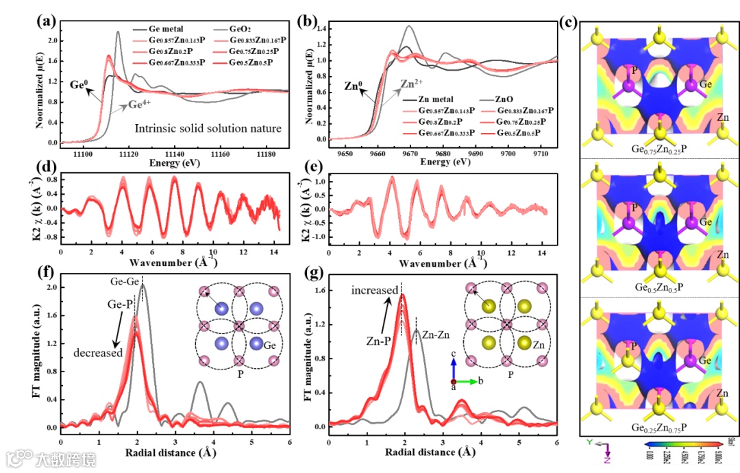 图4. 不同Zn比例下系列Ge1−xZnxP固溶体的XANES图谱(a-b),差分电荷密度(c),k空间图谱(d-e)及拓展边精细结构图谱EXAFS分析(f-g)。
