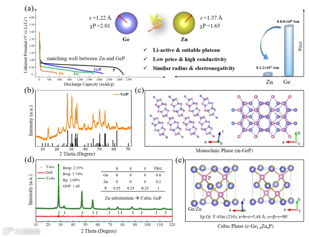 图1. (a)Zn与Ge的原子半径、电负性、电位平台及原料价格比较;单斜相GeP(b-c)和立方相Ge1−xZnxP(d-e)的XRD图谱及晶体结构图。